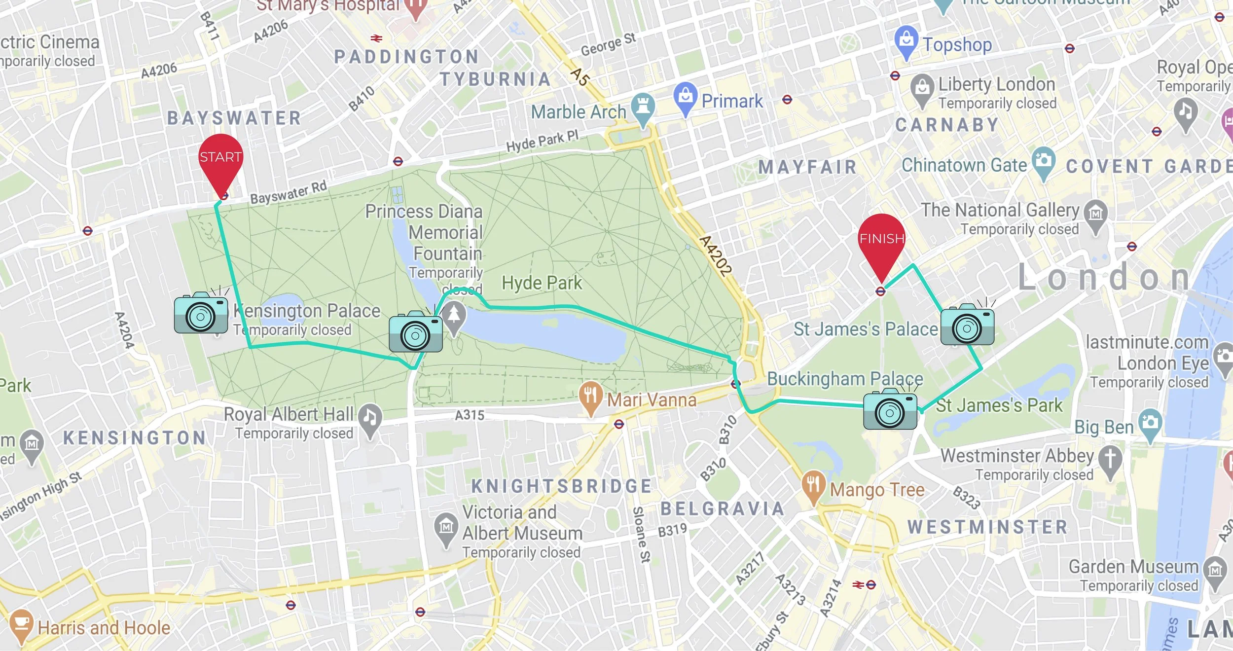 An example of a route through Hyde Park, with the start and end points. It also highlights areas which are great for photos along the route.